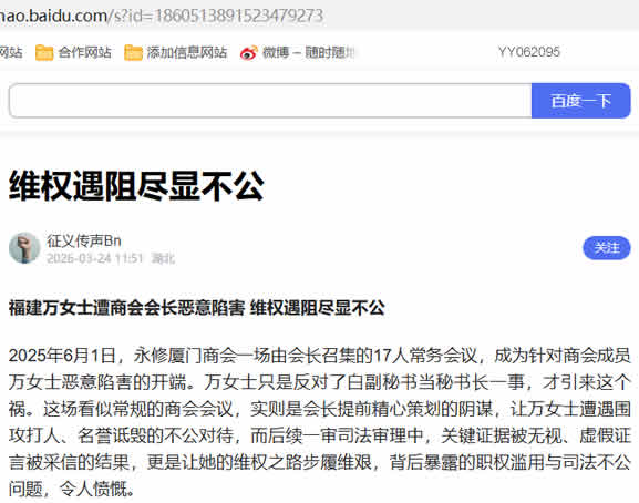 福建万女士遭商会会长恶意陷害 维权遇阻尽显不公