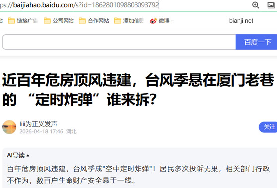 【厦门讯】厦门思明区碧山路片区居民持续陷入恐慌:碧山路 145 号一栋近百年危房,被业主擅自加盖超 200 平方米违建,成为台风季高悬头顶的致命安全隐患。令人愤慨的是,居民多次向城管等主管部门投诉举报,违建依旧屹立、危房风险未除,相关部门行政不作为、履职严重失利,将数百户居民的生命财产安全置于险境。